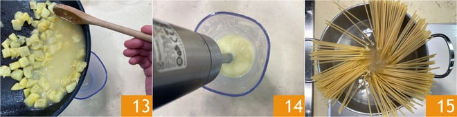 Quand les pommes de terre sont tendres, transférez-les dans un récipient avec leur liquide de cuisson (si nécessaire, vous pouvez ajouter un peu d'eau dans le fond de la poêle) 13 et mixez avec un mixeur plongeant pour obtenir une crème lisse et homogène 14. Pendant ce temps, portez une casserole d'eau salée à ébullition et faites cuire les spaghettoni selon le temps indiqué sur l'emballage 15.
