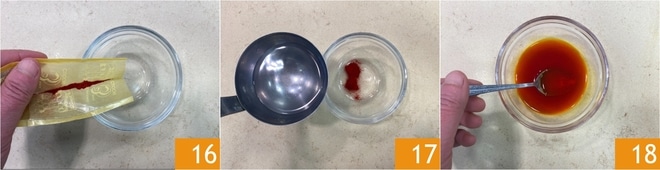 Pendant ce temps, versez le safran dans un petit bol à part 16, ajoutez un peu d'eau des pâtes 17 et mélangez bien pour le dissoudre 18.