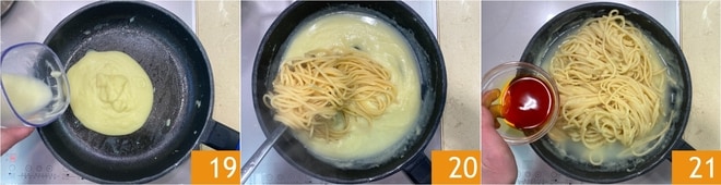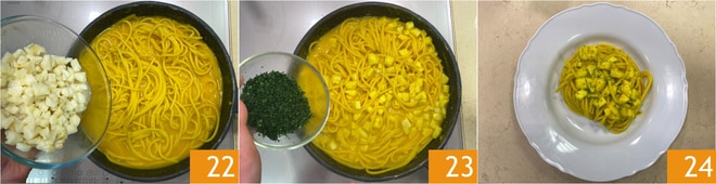 Remettez la crème de pommes de terre dans la poêle 19, ajoutez une louche de l'eau de cuisson des pâtes et égouttez-y les spaghettoni al dente 20, puis ajoutez le safran dissous 21. Mélangez pour bien amalgamer le tout et terminez la cuisson.