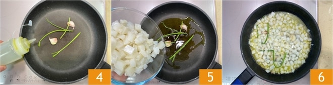 Dans une grande poêle, laissez infuser un filet d'huile avec les gousses d'ail écrasées en chemise et les tiges de persil 4, puis ajoutez la morue 5 et faites rissoler à feu moyen-vif pendant environ 5 minutes 6.