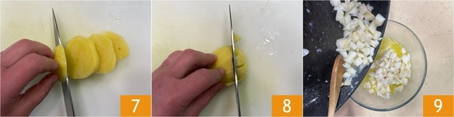 Pendant ce temps, épluchez les pommes de terre et coupez-les d'abord en tranches 7 puis en petits cubes 8. Après les 5 minutes de cuisson, retirez l'ail et les tiges de persil, puis transférez la morue dans un bol avec son jus de cuisson 9.