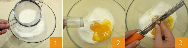 Pour réaliser les spätzle, tamisez la farine dans un bol 1, ajoutez les œufs, salez 2 et aromatisez avec la noix de muscade 3,