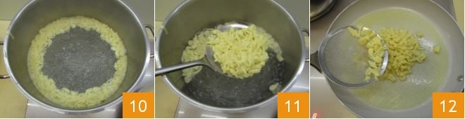 Lorsque les spätzle commenceront à remonter à la surface 10, égouttez-les avec une écumoire 11 et transférez-les directement dans la poêle où vous avez fait fondre le beurre 12