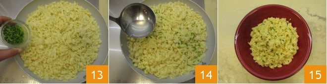 Ajoutez la ciboulette hachée 13, s'ils semblent trop secs, versez une louche d'eau de cuisson 14, faites sauter pour parfumer et servez vos spätzle bien chauds 15 !