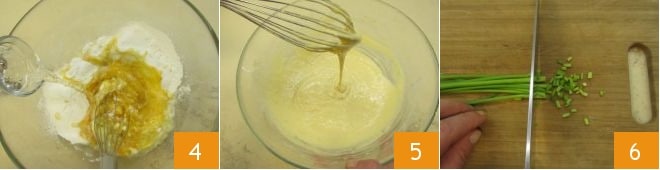 pour finir, versez l'eau à température ambiante en filet (si vous ne réalisez pas les spätzle avec l'outil spécifique mais avec un presse-purée, mettez un peu moins d'eau pour obtenir une pâte plus consistante et moins liquide) 4; mélangez bien avec un fouet pour amalgamer les ingrédients et obtenir un mélange lisse et sans grumeaux qui restera assez liquide 5. Entre-temps, portez à ébullition une casserole pleine d'eau, salez à ébullition : elle servira à la cuisson des spätzle. Pendant ce temps, préparez l'assaisonnement car les spätzle cuisent rapidement : lavez les tiges de ciboulette et hachez-les 6.