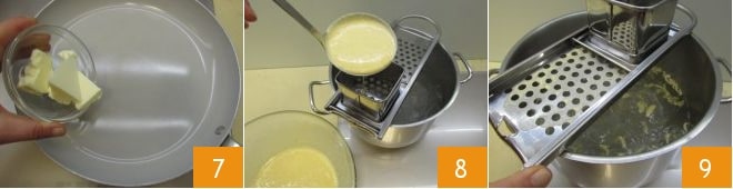 Dans une grande poêle, faites fondre le beurre 7, pendant ce temps, prenez le Spätzlehobel, l'outil pour créer les spätzle, si vous ne l'avez pas, vous pouvez également utiliser un presse-purée. Placez le Spätzlehobel au-dessus de la casserole avec l'eau bouillante, versez dans l'espace prévu une louche de pâte 8, faites glisser l'outil d'avant en arrière, ce qui fera tomber les spätzle fraîchement formés directement dans la casserole, dès qu'ils seront en contact avec l'eau bouillante, les spätzle cuiront en quelques instants 9, comme pour les gnocchis.