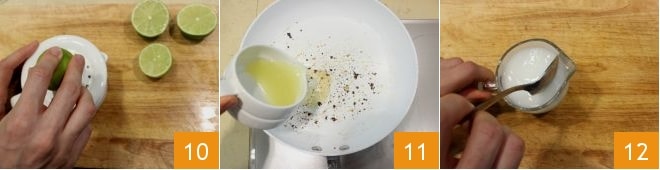 Pressez le jus de deux citrons verts 10 et dans la poêle où vous avez fait sauter les brochettes, ajoutez au fond de cuisson le jus des citrons verts 11 et faites-le réduire quelques instants. Puis versez la maïzena dans l'eau et dissolvez-la 12.
