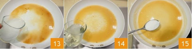 et versez-la dans la poêle 13 avec le vin blanc 14, en mélangeant jusqu'à ce que le liquide ait une texture crémeuse. Ajoutez une cuillère de sucre en poudre 15
