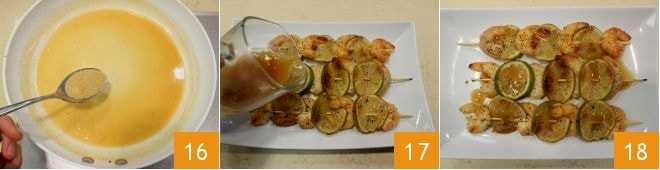 et une de sucre de canne 16. Mélangez le tout avec une cuillère en bois et laissez épaissir. Puis versez la crème obtenue sur les brochettes de crevettes, citron vert, miel et graines de pavot 17 et servez-les !