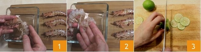 Pour préparer les brochettes de crevettes, citron vert, miel et graines de pavot, commencez par nettoyer les crevettes : détachez la tête des crustacés 1 et retirez la carapace 2. Ensuite, coupez et coupez les citrons verts en tranches 3