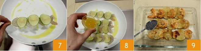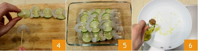 Enfilez sur chaque brochette quatre crevettes en les alternant avec une tranche de citron vert (donc 4 crevettes et 3 tranches de citron vert par brochette pour un total de 8 brochettes) (4-5). Pendant ce temps, chauffez dans une poêle un filet d'huile 6