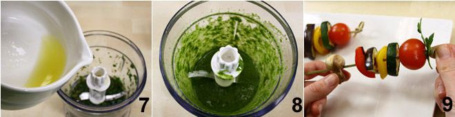 le jus de citron 7 et l'ail, mixez tous les ingrédients jusqu'à obtenir une préparation crémeuse 8. Commencez maintenant à composer les brochettes en insérant une feuille de persil puis le reste des ingrédients en les alternant : les tomates, les courgettes, les poivrons, les aubergines, les champignons et les billes de mozzarella. Disposez les brochettes sur un plat de service et accompagnez-les de la sauce au persil et aux câpres.