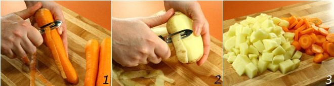 Épluchez les carottes 1 et les pommes de terre 2; coupez les pommes de terre en morceaux et les carottes en rondelles 3, puis faites-les cuire dans de l'eau bouillante salée 4.