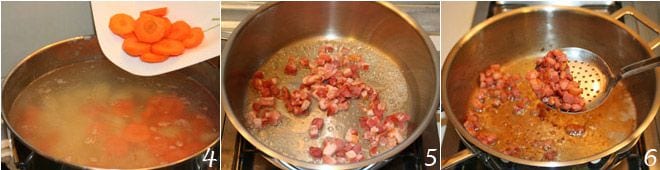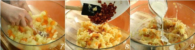 Lorsque les légumes sont prêts à être écrasés, égouttez-les bien et mettez-les dans un bol ; avec une fourchette, écrasez-les 7 jusqu'à obtenir une purée. Ajoutez le beurre, mélangez puis ajoutez les lardons croustillants 8, ajoutez la muscade râpée, le poivre et enfin incorporez la crème 9; après avoir mélangé tous les ingrédients, servez immédiatement le stoemp aux carottes.