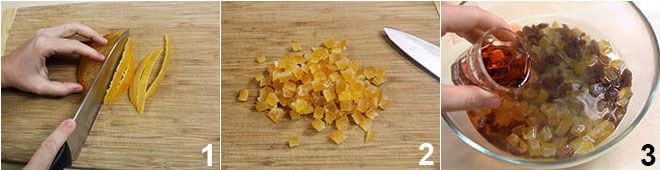 Pour préparer le stollen, commencez par couper l'orange confite en tranches et réduisez-la en dés (1-2). Mettez-la à tremper avec les raisins secs dans un bol avec de l'eau tiède, de manière à ce que le tout soit recouvert à niveau, et ajoutez 50 ml de rhum prélevés sur la dose totale 3.