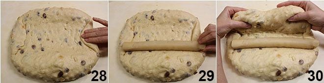 pressez avec le rouleau à pâtisserie au centre, pour bien sceller et donner au stollen sa forme classique 31. Modelez un peu avec les mains pour donner au stollen une forme régulière 32 et placez-le sur une plaque recouverte de papier sulfurisé. Enfournez dans un four statique déjà chaud à 180° pour environ 60-70 minutes, jusqu'à ce que le stollen soit ambré 33.