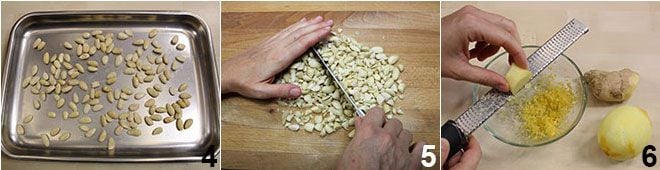 Entre-temps, disposez les amandes mondées sur une plaque de cuisson et faites-les griller au four, jusqu'à ce qu'elles deviennent croquantes mais pas trop colorées 4. Si vous avez des amandes avec la peau, faites-les blanchir pendant 5 minutes dans de l'eau bouillante, puis retirez leur peau qui se détachera facilement de cette manière. Lorsque les amandes seront froides, hachez-les grossièrement 5 et mettez-les de côté. Râpez le zeste du citron et le gingembre dans un bol et mettez-les de côté 6.