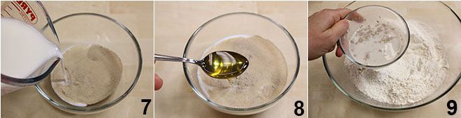 Dissolvez la levure (vous pouvez également utiliser un cube de levure de boulanger fraîche émietté) dans un peu de lait tiède (prélevé sur la dose totale de la recette) et ajoutez-y une cuillère à café de miel (7-8). Disposez la farine dans un bol et formez un puits au centre, dans lequel vous verserez la levure 9.