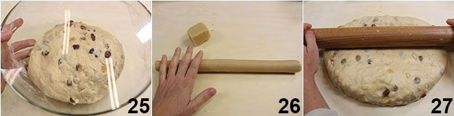 Puis placez-la dans un grand bol, couvrez d'un film plastique et laissez lever pendant une heure dans un endroit tiède 25. Entre-temps, prenez le massepain et donnez-lui une forme cylindrique 26. Une fois le temps de levée écoulé, mettez la pâte sur un plan de travail, donnez-lui une forme rectangulaire et avec un rouleau à pâtisserie, aplatissez au centre, en allongeant un peu la pâte de manière à obtenir sur les côtés plus longs un renflement plus épais que l'autre 27.
