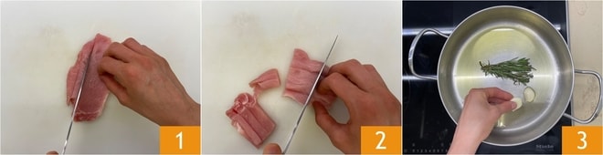 Pour préparer les émincés de porc à la bière. Tout d'abord, coupez la longe en tranches, puis découpez des lanières 1 et poursuivez de manière à obtenir des émincés 2. Dans une casserole, versez l'huile d'olive extra vierge, le romarin et l'ail 3. Laissez infuser à feu doux.