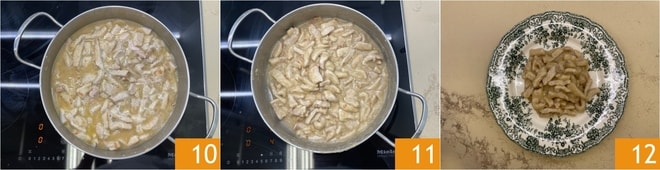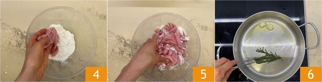Pendant ce temps, versez la farine dans un bol et ajoutez les émincés de porc 4, mélangez pour bien les fariner 5. À ce stade, retirez l'ail et le romarin de la casserole 6.