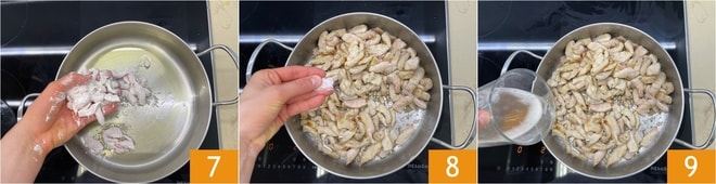 Enlevez l'excès de farine des émincés et transférez-les dans la casserole 7. Salez 8, faites bien dorer, et déglacez avec la bière 9.