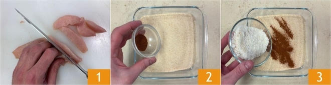 Pour préparer les lanières de poulet à la friteuse à air, commencez par couper le blanc de poulet en lanières d'environ 1,5-2 cm de largeur 1 et transférez-les dans un bol. Mettez la chapelure dans un plat, puis assaisonnez avec du paprika 2 et du parmesan râpé 3.
