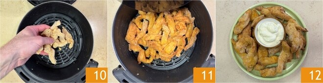 Après les avoir panées, disposez les lanières de poulet dans la friteuse à air (nous avons utilisé une friteuse d'une capacité de 6 litres) 10 et faites cuire à 180° pendant 15 minutes, jusqu'à ce qu'elles soient bien dorées et croustillantes 11. Servez immédiatement vos lanières de poulet à la friteuse à air accompagnées d'un petit bol de mayonnaise ou d'autres sauces à votre goût 12 !