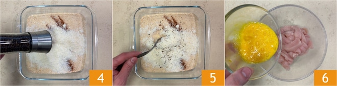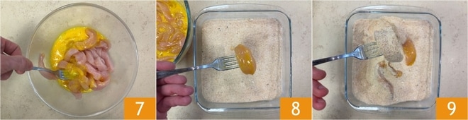 Mélangez bien 7, puis passez les lanières dans le plat avec la chapelure 8 et recouvrez-les uniformément 9.