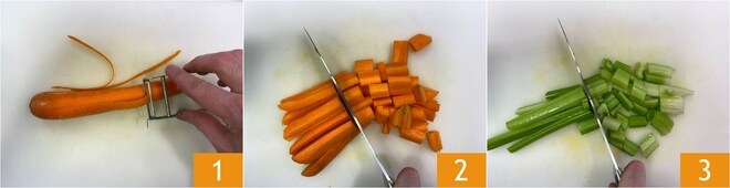 Pour préparer la stracciatella en bouillon de légumes, la première chose à faire est justement de préparer le bouillon. Lavez bien les légumes et épluchez les carottes 1. Coupez-les ensuite en morceaux 2 et faites de même avec le céleri 3.