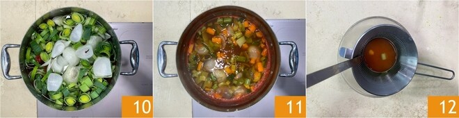 Faites cuire à feu moyen pendant environ 40 minutes 10. Une fois ce temps écoulé 11, filtrez le bouillon 12.