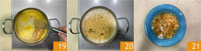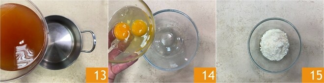 Versez-le à nouveau dans la casserole 13 et maintenez-le au chaud. Pendant ce temps, dans un bol, versez les œufs 14 et ajoutez le parmesan 15.
