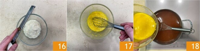Râpez également un peu de noix de muscade à l'intérieur 16 et mélangez avec un fouet. Versez le mélange d'œufs en filet dans le bouillon bouillant, en mélangeant avec le fouet 18.