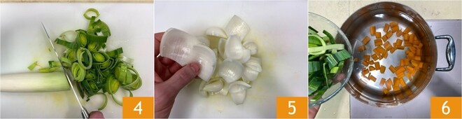 Coupez également le poireau en rondelles en éliminant la partie avec les racines 4 et divisez les oignons en lamelles ; séparez ensuite les différentes couches 5. Dans une casserole, versez environ 2 litres d'eau froide et ajoutez les légumes 6.