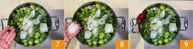 Ajoutez également les clous de girofle 7, le sel 8 et le concentré de tomate 9.