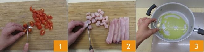 Pour préparer les strozzapreti avec espadon, tomates cerises et câpres, commencez par dessaler les câpres sous l'eau courante, en les rinçant plusieurs fois soigneusement. Mettez-les ensuite de côté. Prenez ensuite les tomates cerises et coupez chacune en 4 parties 1. Occupez-vous ensuite de l'espadon : ôtez-en la peau, découpez-le en bandes d'environ 2 cm de large, puis réduisez-le en cubes 2 : mettez de côté les tomates cerises et l'espadon. Arrosez maintenant une poêle antiadhésive d'un filet d'huile et faites blondir l'ail épluché et laissé entier (ainsi il sera plus facile de le retirer par la suite) 3. Laissez rissoler pendant environ 2 à 3 minutes à feu moyen.