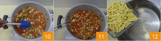 Mélangez les ingrédients pour amalgamer les saveurs 10. Ensuite, retirez l'ail 11 et éteignez le feu. Pendant ce temps, faites cuire les pâtes dans une grande quantité d'eau bouillante, salée selon votre goût 12.