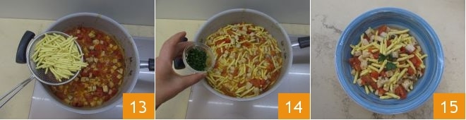 Quand elles seront cuites, égouttez-les et versez-les directement dans la poêle avec le condiment d'espadon et tomates cerises 13. Saupoudrez du reste de persil (toujours finement haché) 14 et mélangez les ingrédients, puis dressez vos strozzapreti avec espadon, tomates cerises et câpres 15 et servez-les encore chauds.