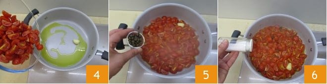 Ajoutez les tomates cerises 4 et les câpres dessalées 5, puis ajustez le sel 6 et le poivre. Laissez cuire ainsi pendant environ 10 minutes à feu doux.