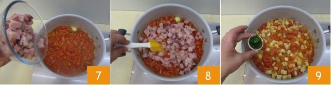 À ce stade, ajoutez également l'espadon 7 et mélangez les ingrédients 8 pour favoriser une cuisson uniforme. Laissez cuire à feu doux pendant encore 5 minutes. Versez maintenant la moitié de la quantité de persil finement haché 9.