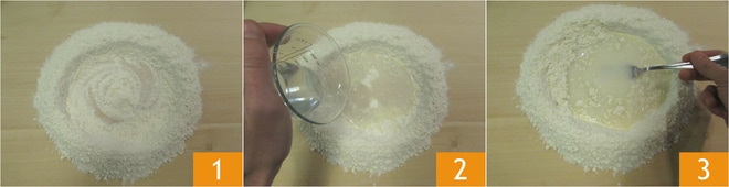 Pour réaliser les strozzapreti, versez sur une planche la farine en fontaine 1, ajoutez une pincée de sel et commencez à mélanger avec l'eau tiède 2 en vous aidant d'une fourchette 3.