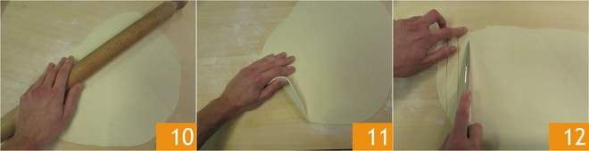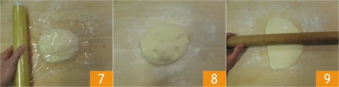 Laissez reposer la pâte au moins 30 minutes, couverte d'un film plastique 7, ou d'un torchon, à température ambiante ou au réfrigérateur s'il fait trop chaud. Passé ce temps, reprenez le pâton et déposez-le sur une planche farinée 8. A l'aide d'un rouleau à pâtisserie, commencez à étaler la pâte 9.