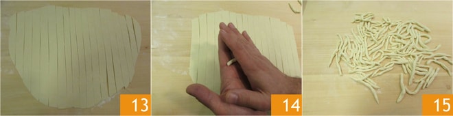 Une fois les bandes obtenues 13, prenez-les une par une et roulez-les entre vos paumes pour les faire glisser délicatement 14. Détachez ensuite des morceaux d'environ 8-10 cm et déposez-les au fur et à mesure sur la planche farinée 15. Vos strozzapreti sont prêts !