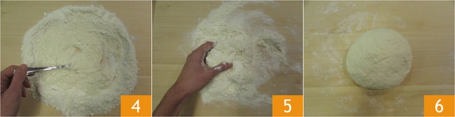 Une fois que l'eau est absorbée 4, commencez à pétrir à la main 5 jusqu'à obtenir une pâte lisse et homogène 6.