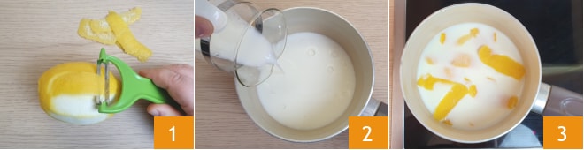Pour réaliser le strudel à la crème pâtissière et aux fraises, commencez par préparer la crème pâtissière : prélevez le zeste de citron avec un économe, en veillant à ne pas retirer la partie blanche 1, puis versez le lait dans une petite casserole 2, ajoutez le zeste de citron 3 et portez à frémissement à feu doux.