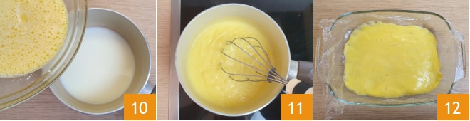 À ce stade, remettez la casserole de lait sur le feu et versez le mélange de jaunes et de lait à l'intérieur 10, puis faites cuire à feu moyen-doux jusqu'à ce que la crème s'épaississe, en remuant continuellement avec le fouet 11; cela prendra environ 10 minutes. Une fois prête, transférez la crème pâtissière dans un plat et couvrez immédiatement de film alimentaire au contact 12. Laissez refroidir à température ambiante pendant environ une heure.