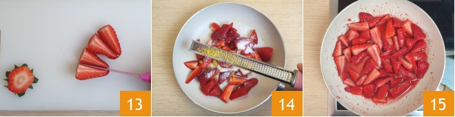 Entre-temps, lavez les fraises et coupez-les en 4 parties 13. Versez les fraises dans une poêle antiadhésive, ajoutez le sucre et le zeste de citron râpé 14 et faites cuire à feu vif pendant 5 minutes, de manière à ce qu'elles libèrent une partie de leur jus 15. Éteignez le feu et réservez.