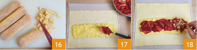 Coupez également les biscuits à la cuillère en morceaux 16. Une fois le temps de refroidissement de la crème écoulé, déroulez la pâte feuilletée avec le papier sulfurisé et placez-la avec le côté long vers vous. Répartissez la crème au centre en formant une bande d'environ 8 cm de large et laissez libre quelques centimètres de chaque côté, puis couvrez avec les fraises, en veillant à ne pas verser aussi le jus qui risquerait de détremper la pâte feuilletée 17. Enfin, émiettez les morceaux de biscuits à la cuillère sur les fraises pour absorber également le liquide restant 18.