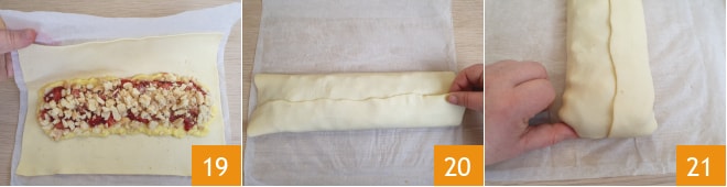 Refermez le strudel, en vous aidant du papier sulfurisé dessous 19 : ramenez les 2 bords vers le centre 20 et repliez les extrémités sous le strudel pour éviter que la garniture ne s'échappe pendant la cuisson 21.