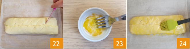 Pratiquez des entailles obliques avec un couteau sur toute la surface 22, puis mélangez le jaune avec le lait dans un bol 23 et badigeonnez le strudel avec le mélange obtenu 24. Cuisez au four statique préchauffé à 180° pendant environ 40 minutes.